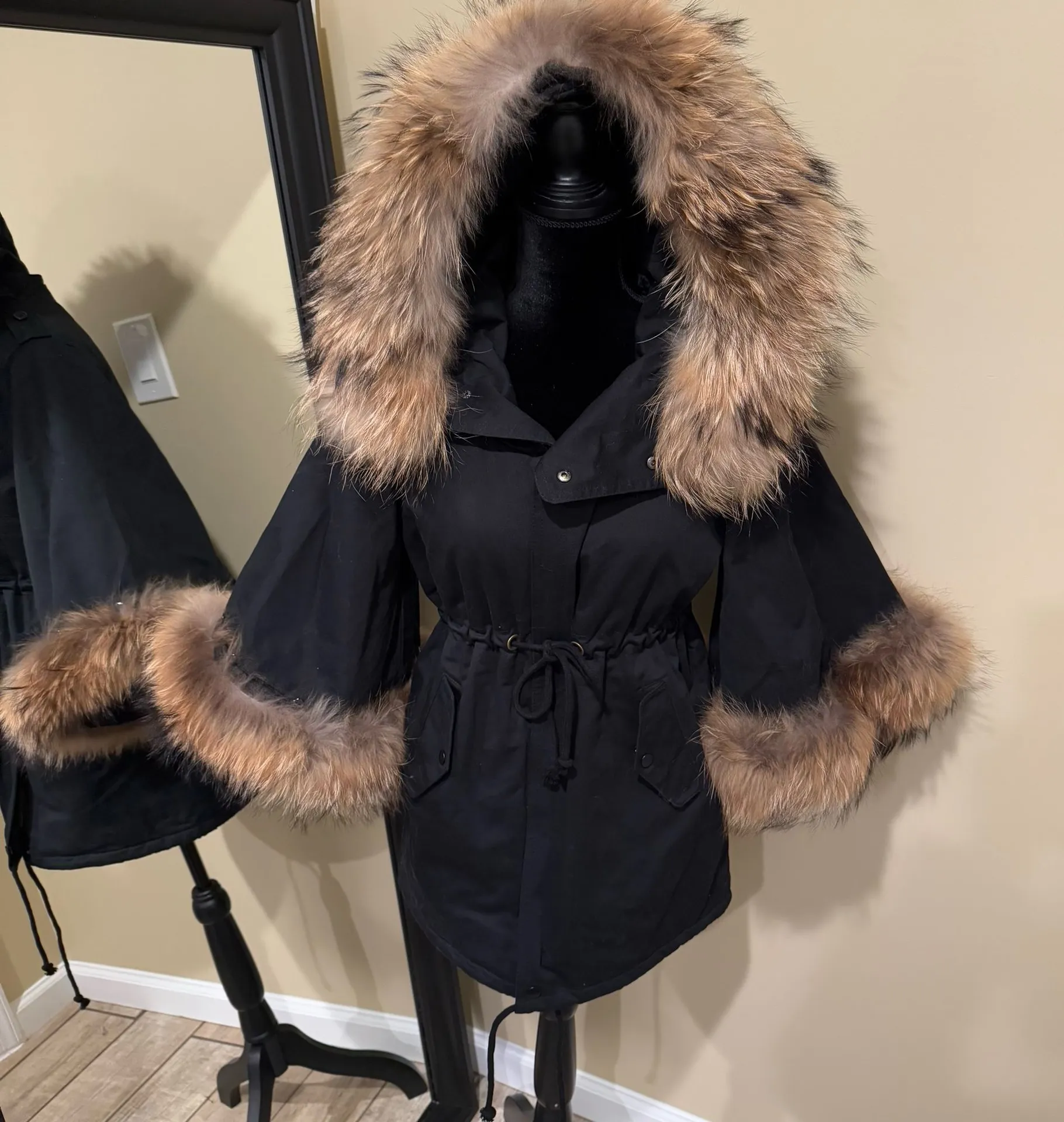 The jacket is new without tag. It is size M, but it runs small. For reference I am 110lbs and 5’2” and it fits me well. I am normally a size XS-S. Mannequin measurements: Bust: approx 34" 1/2 Waist: approx 26" Lenght: approx 23" Shoulders: approx 15" Jacket measurements: Bust: approx 38” Length: approx 31” Sleeve: approx 15” Shoulder: approx 15” •Black color •Detachable real raccoon fur hood collar and raccoon fur sleeves •Adjustable waist with cord •Zipper closure •Lined •The hood is not removable •Two front pockets It is sitting in a vacuum bag together with other clothes that I don’t wear and it might have detergent scent. Please ask for all the details necessary before you purchase!