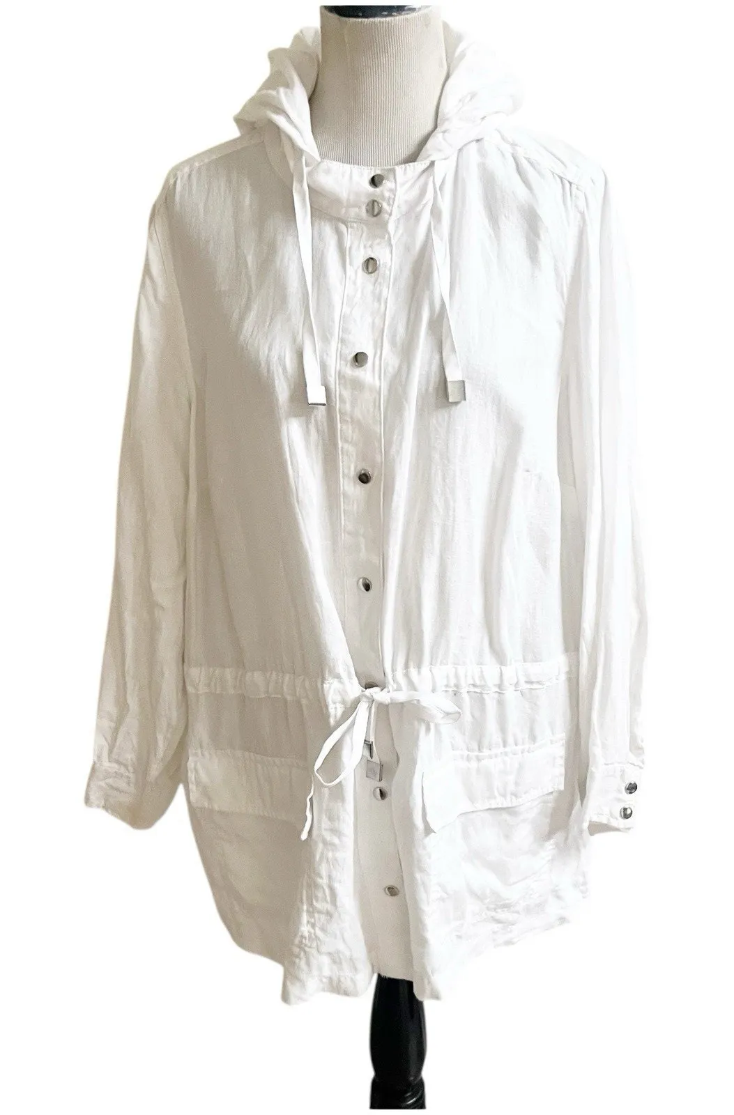 The Rachel Rachel Roy White 100% Linen Jacket in size 1X is a stylish and versatile piece perfect for various occasions such as travel, parties, and casual outings. Made from washable linen fabric, this mid-length jacket features a snap front closure, hood with drawcord, and drawcord waist for a customizable fit. With its lightweight design and faux leather accents, this jacket is ideal for the spring and summer seasons. The classic white color and sleek silhouette make it a luxurious addition to any wardrobe, offering both comfort and style. Excellent used condition no holes or stains 100% linen 25” pit to pit ; 31” length Dawstring at waist Front pockets Crisp white #beach#coastal#nautical#sailing