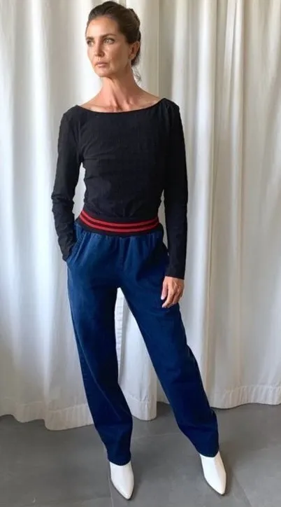 RACHEL COMEY Doxa Pant ~ Acid Wash Denim Jeans Navy Blue with red/black striped waistband Size: Large New with Tags Acid wash straight leg pull on pant in navy with a striped elastic waist. High Rise Straight Leg Pull-on Style Cut for a relaxed fit Elastic Waist Non-stretch fabric 100% cotton Made in USA Fit Tip: Fits true to size Approximate Measurements: Waist 30" Front Rise 13" Inseam 31" Cuffs 17" Minimalist Chic