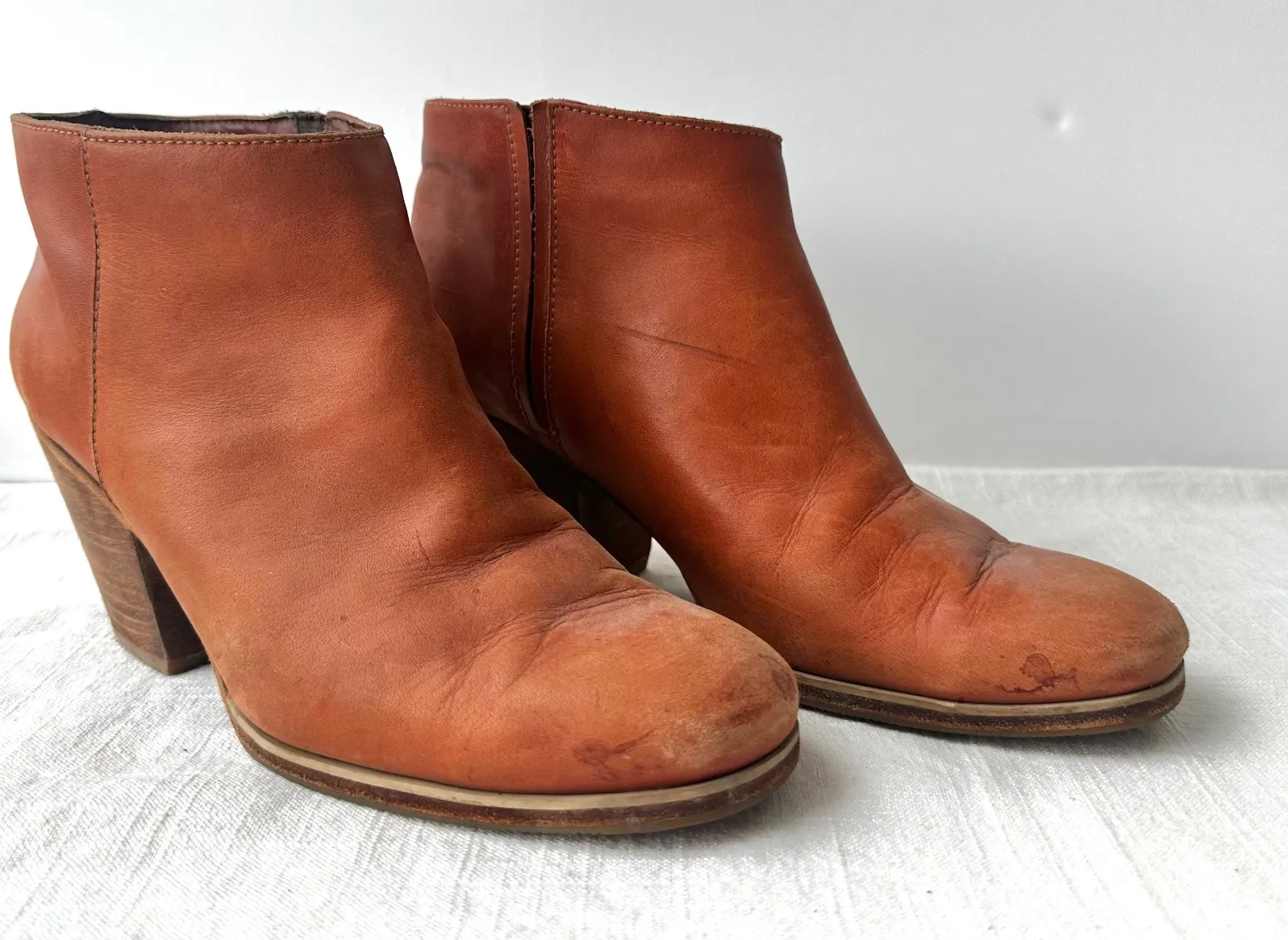 Step into style with these versatile leather ankle boots, a perfect blend of fashion and function. The rich, warm brown leather exudes a timeless appeal, while the sturdy block heel provides comfortable elevation for all-day wear. These boots feature a convenient side zipper for easy on and off, making them ideal for busy mornings. The classic silhouette pairs effortlessly with a variety of outfits, from jeans and a sweater to a skirt and blouse. Imagine yourself strolling through a fall festival, enjoying a casual brunch with friends, or adding a touch of sophistication to your everyday office attire with these chic ankle boots. Style: Bootie Color: Brown Department: Women Upper Material: Leather Shoe Shaft Style: Ankle Lining Material: Leather Outsole Material: Rubber Heel Height: Mid (2-2.9 in) Heel Style: Block Occasion: Casual Features: Side Zipper, Block Heel, Comfort, Everyday Wear, Stylish Type: Boot Model: Classic Ankle Keywords: leather ankle boots, brown boots, block heel boots, womens boots, casual boots, everyday boots, fall fashion, ankle booties, leather booties, side zip boots, comfortable boots, stylish boots, womens footwear
