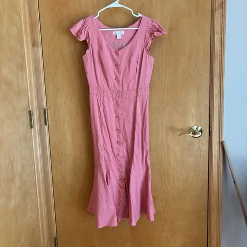The Rachel Parcell Dress in women's XS size is a stylish pink linen blend midi dress with ruffled ac... Show more