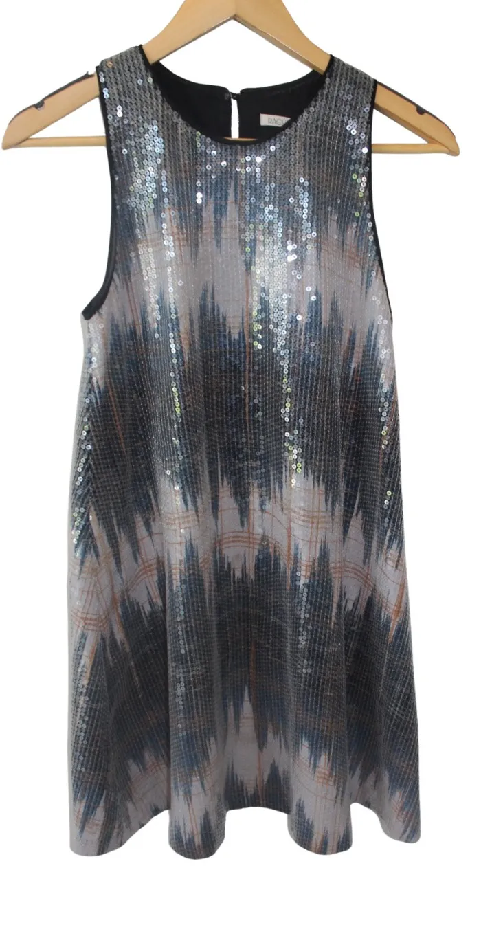 The Rachel Rachel Roy Women's Sparkle Sequin Shift Dress in size S is a stylish and eye-catching option for any party or cocktail event. The geometric pattern of blue and gray sequins gives off a modern and trendy vibe, perfect for a city-inspired occasion. The sleeveless design, round neckline, and zip closure add to the chic and sophisticated look of the dress. Made from polyester jersey fabric, this short dress is versatile for all seasons and is sure to make a statement at any event. DIMENSIONS: 32IN LONG 17IN PTP