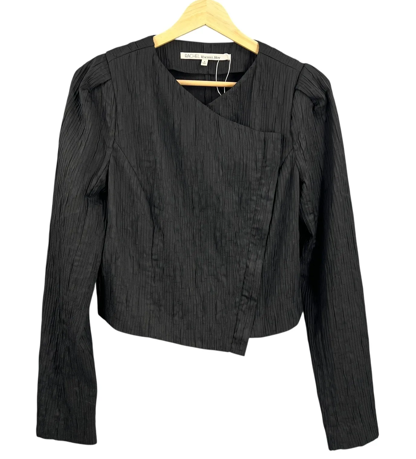 Rachel Roy Black Pleated Jacket Size 8 Clean, chic black jacket from Rachel Roy. Features a modern asymmetrical zipper front with a hidden inner button closure, zippered cuffs, and sleek pleated texture. Cuts at a flattering waist length. Size 8 — excellent condition (likely unworn). Measurements: armpit to armpit ~17.5", waist ~16.5", length ~21", sleeve 27", shoulder width ~13". Modern minimalist style, perfect for date nights, evenings out, or pairing with jeans or trousers for a polished but edgy outfit. Keywords: Rachel Roy, blazer, jacket, textured, black, asymmetrical, zip front, modern, chic, business casual, evening wear, structured, puff sleeve