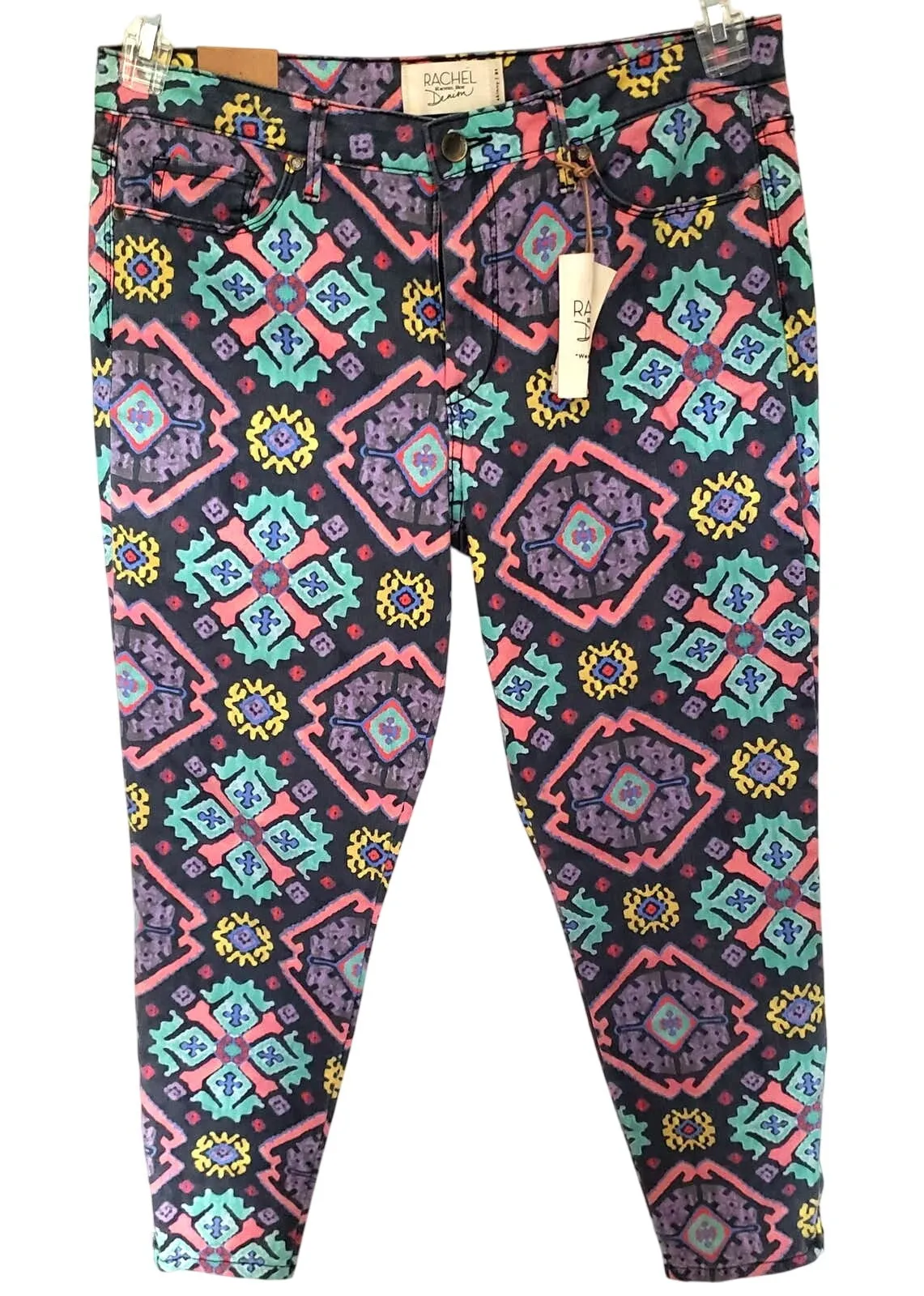 Rachel Roy Denim The Rachel Fit Skinny Ankle Zip Jeans in tribal print Y2K Festival Mid rise with zip on hem of pants, please see inseam 5 pocket with button and zipper closure New with tags Size 31 98% Cotton 2% Spandex Approximate measurements: Waist 17.25" Rise 10.5" Inseam: 28" Leg opening: 5.5" aztec print, tribal pattern, geometric jeans, colorful denim, festival fashion, boho chic, y2k revival, statement pants, Rachel Roy jeans, mid rise, ankle zip, skinny fit, eclectic style, patterned denim, bold print, street style, retro vibe, indie aesthetic, vintage inspired