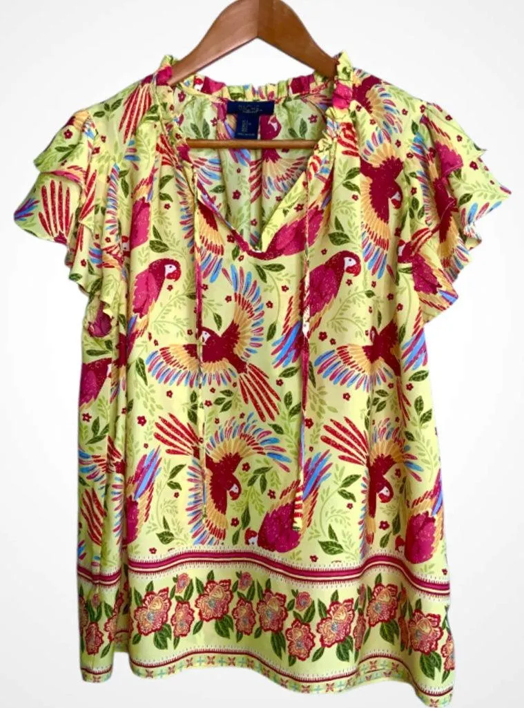 Charming blouse with vibrant parrot design. Features ruffled sleeves and a lively pattern. Like New... Show more