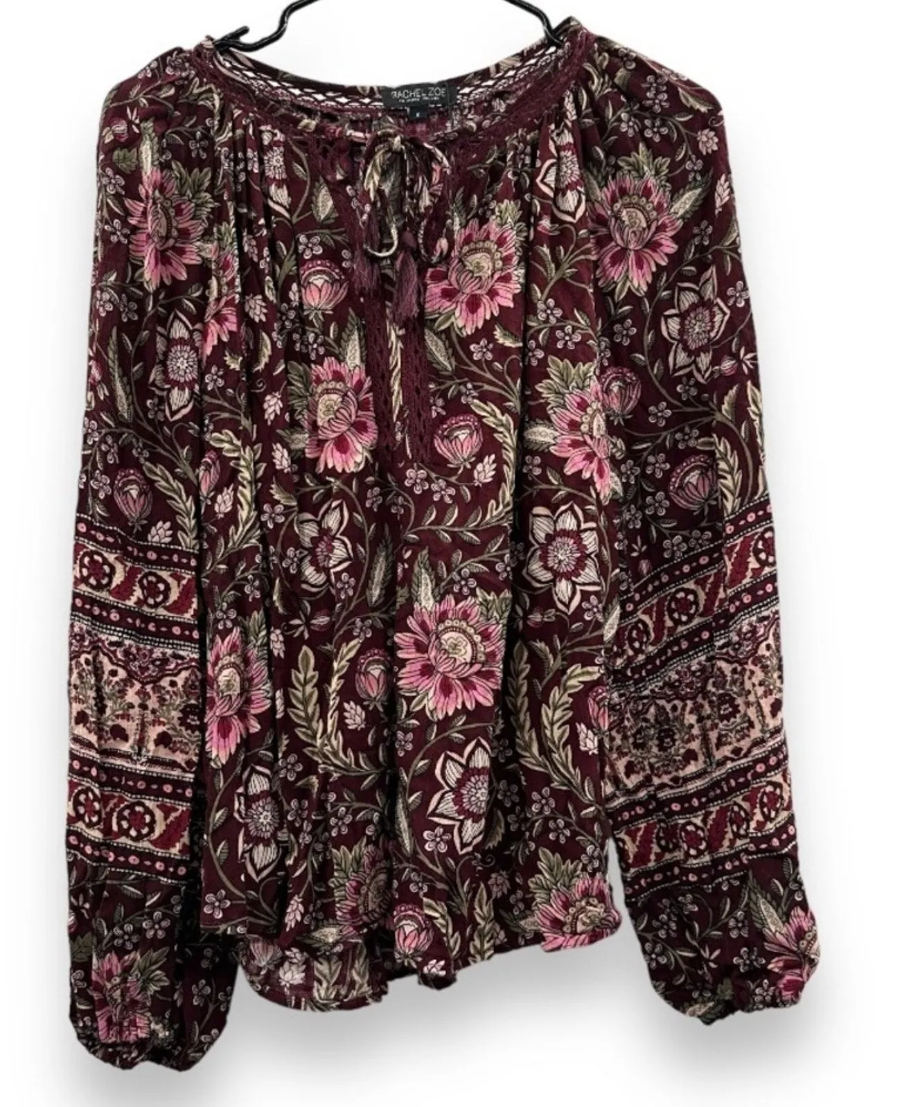 Rachel Zoe Burgundy Paisley Floral Print Long Sleeve Tie Neck Top Long sleeves Elasticized sleeve cu... Show more