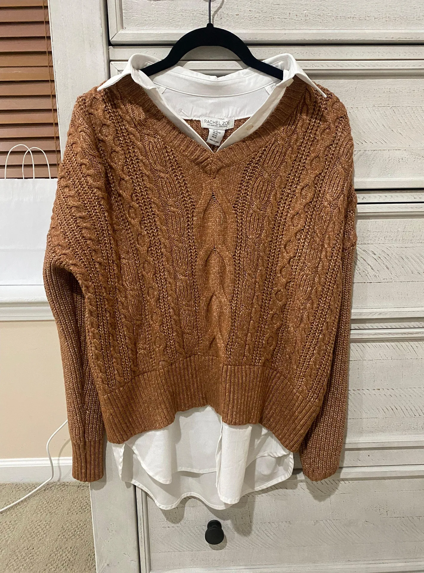 This Rachel Zoe burnt orange-brown cable knit sweater is perfect for fall! The white button-up look... Show more