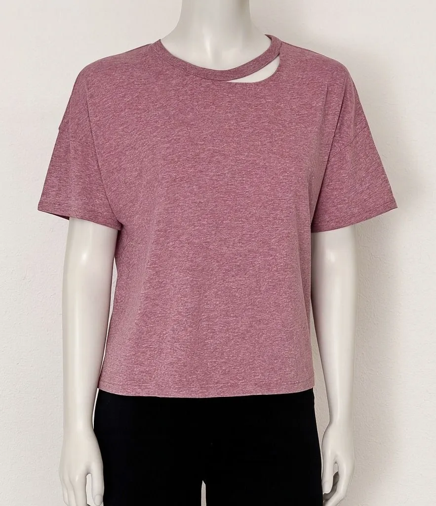 Heathered pink short sleeve tee with relaxed fit and round neckline. Features geometric cutout detai... Show more