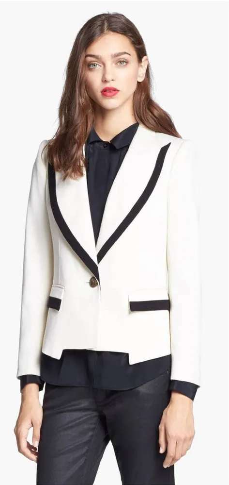 True to size. DETAILS & CARE Bold black-leather trim pops on an off-white wool jacket impeccably tai... Show more