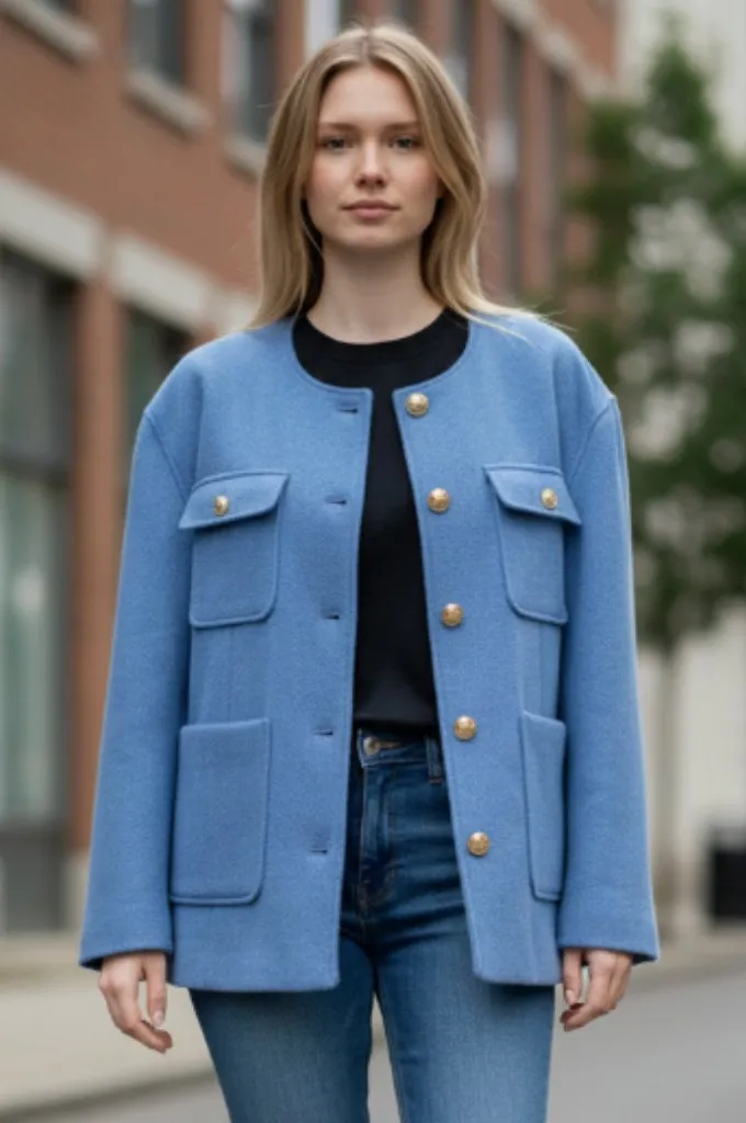Gorgeous powder blue color Gold button detail Round neckline Long sleeve Fully lined