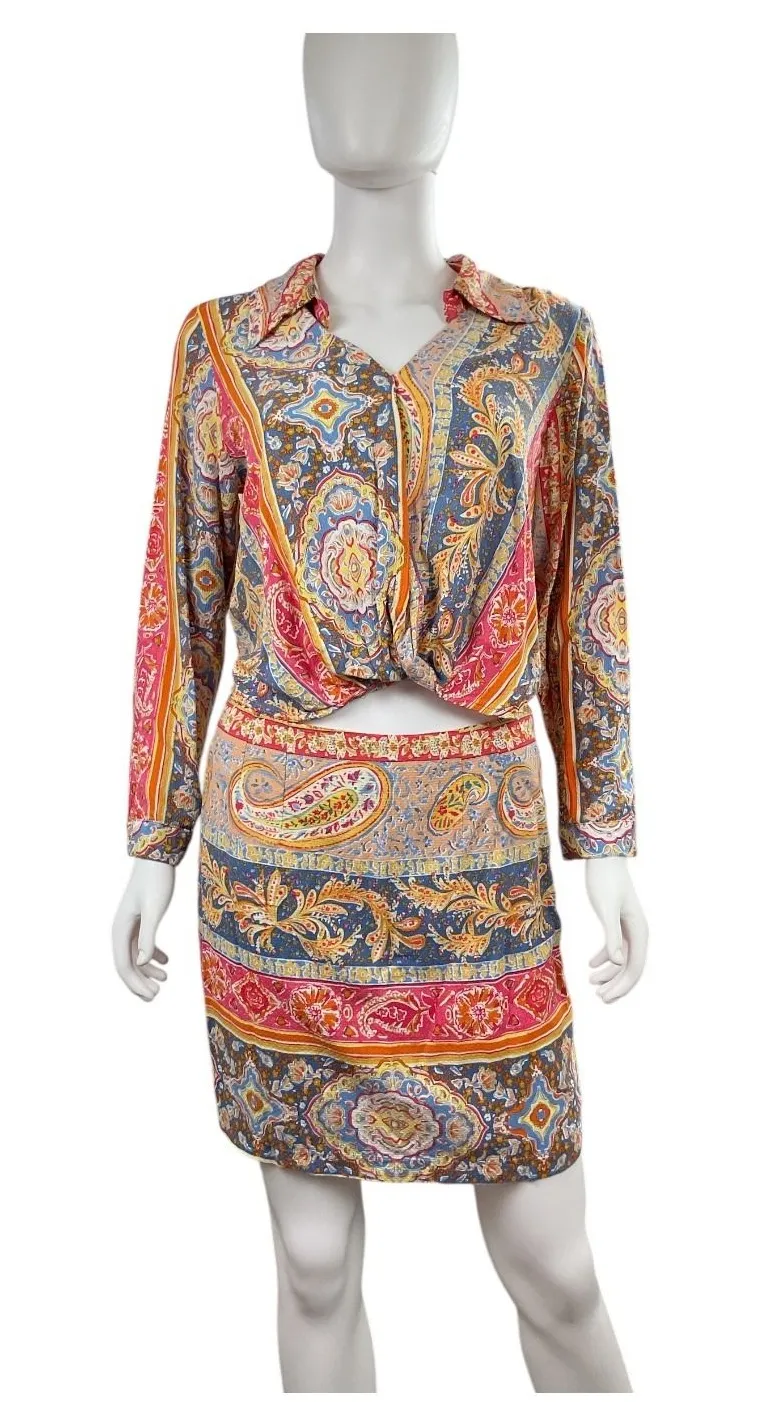 A Rachel Zoe two-piece set in size medium featuring a vibrant paisley print. The long-sleeved collar... Show more