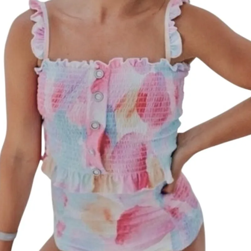 women's smocked ruffle tankini swim top SW2 2964 Brand: Rad Swim Fabric: nylon spandex Condition: preowned Size: medium Color: pink blue Closure: pull on, adjustable back tie Other: removable pads, adjustable stretch straps tube top swim top bikini top wire free classic chic girly femme cottage beach pool spa resort cruise 8 10 med M MD bathing suit vacation island isle boho cute smocked elastic stretchy flattering watercolor pink blue peach fun bright colors Rad Swim Betsy medium smocked ruffle tankini swim top SW2 2964