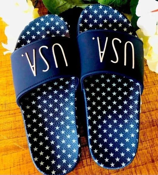 Show your patriotic style with these Rae Dunn USA Slide Sandals in a classic navy blue with white st... Show more