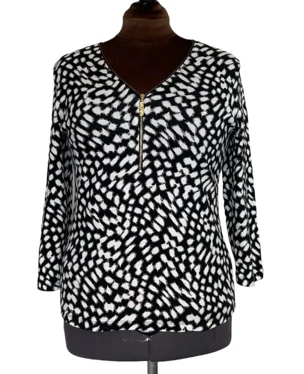 Elegant black and white blouse with abstract pattern. Features a stylish V-neck and three-quarter sl... Show more
