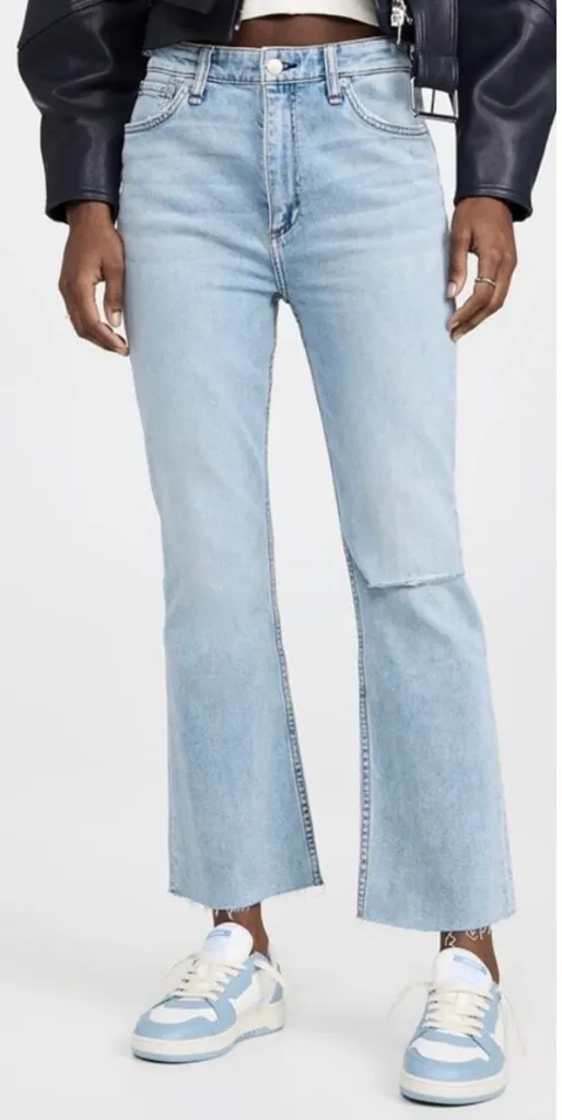 A casual pair Rag & Bone jeans in a flare silhouette, imbued with a touch of stretch and given a broken-in feel with a shredded hole and frayed hem. Itβs the perfect flare from Rag & Bone. Casey is the ultra slimming flare cropped jean, ideal for a dressed up or casual look. Crafted from stretch fabric for a supreme fit and feel. These jeans are in the color Lucy, a light indigo wash with a distressed knee slit.