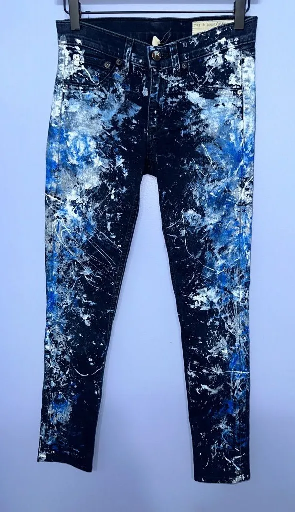 Skinny jegging material Very stretchy Unique paint splattered jeans Flat lay measurements: Wai... Show more