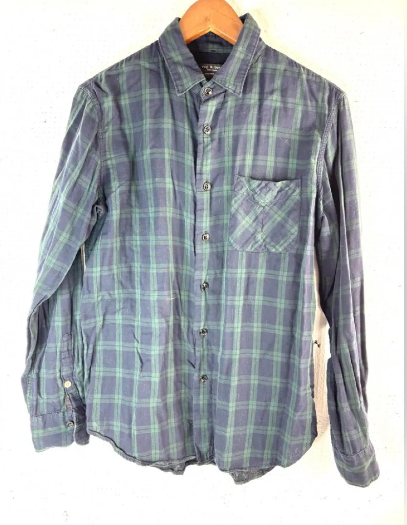 Excellent pre-owned condition Stylish plaid button down shirt. Features blue and green check patte... Show more