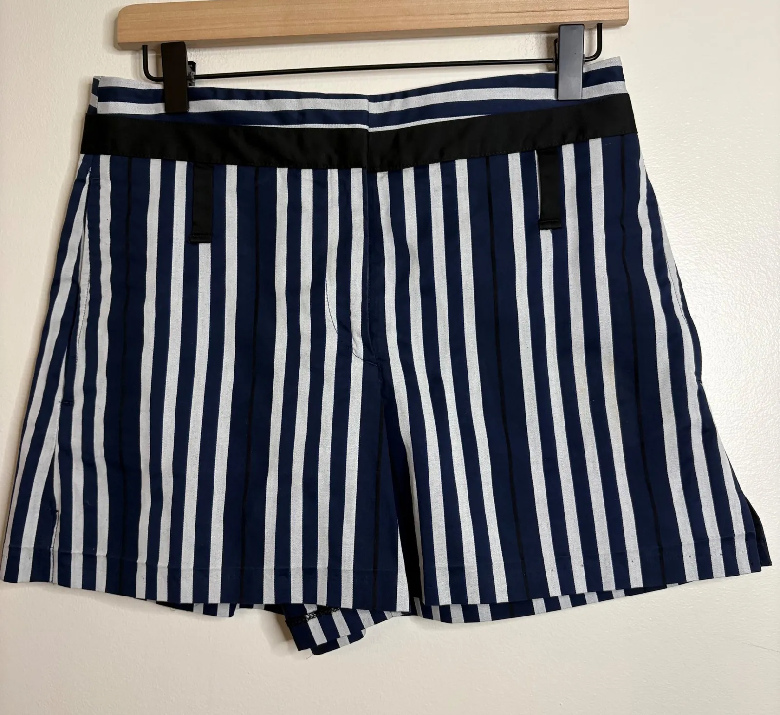 Rag & Bone New York striped tailored shorts in navy white and black. These chic shorts feature a hig... Show more