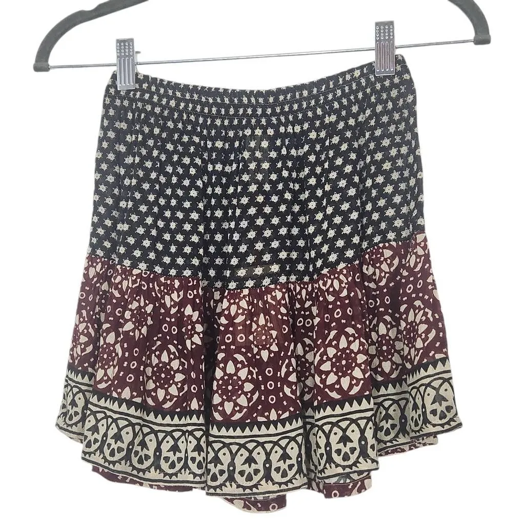 Raga boho mini skirt. Make me an offer! Style: mini, flirty, pull-on with elastic waist Color: multi-color with cream, burgundy, and black Special features: beautiful pattern, lightweight Condition: new with tags Measurements are taken while laying flat and shown in images. 1124-107-C2a