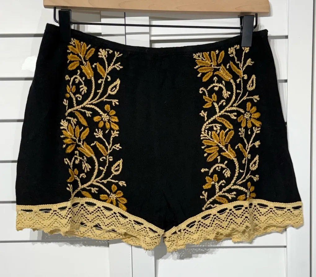 Elegant high waist shorts with intricate gold floral embroidery. Features delicate lace trim. Perfect for a chic look. ✔️ high rise waist ✔️ pull on with side zipper ✔️ inseam 3.5” ✔️ women’s small ✔️ brand new with tags ✔️ viscose ✔️ hand wash 💸 bundle and save!