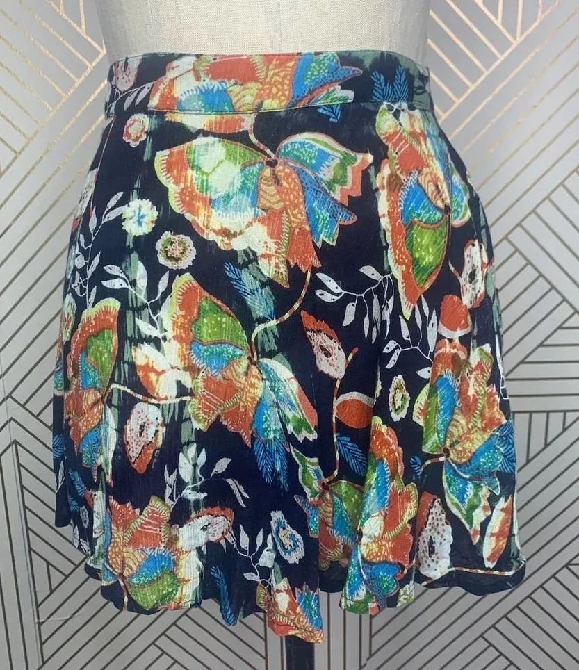 NWT Raga Floral Printed Mini Skirt in Navy & Orange Multi. Mini floral print skirt w/ butterflies and birds Black with orange, blue, green, white floral multi Elastic waist Pull-on Size US Large 100% viscose Waist is approx 15” Hip is approx 24” Length is approx 14”