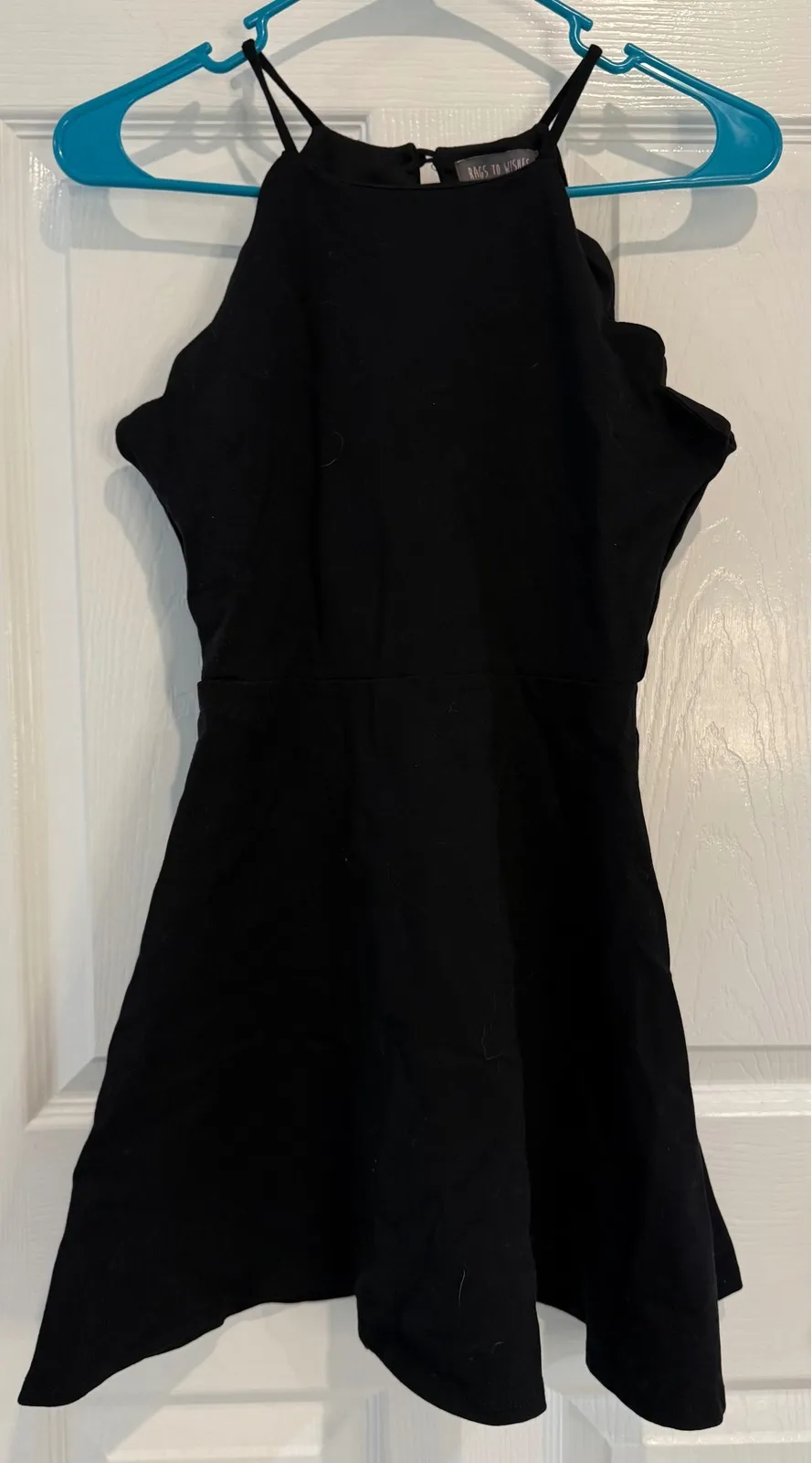 Chic and versatile little black dress, perfect for a variety of occasions. This sleeveless dress features a flattering fit-and-flare silhouette that accentuates the waist and creates a feminine shape. The halter neckline adds a touch of sophistication, while the unique scalloped trim around the shoulders provides a playful and stylish detail. A keyhole back adds a subtle hint of allure. This dress is ideal for cocktail parties, date nights, or even a semi-formal event. Style: Fit & Flare, A-Line, Mini Dress Length: Mini Color: Black Department: Women Sleeve Length: Sleeveless Pattern: Solid Occasion: Party/Cocktail, Casual Material: Rayon Blend, Nylon, Spandex, Polyester Neckline: Halter Fabric Type: Rayon Character: Party Girl, Date Night, Cocktail, Classic, Elegant Ask for measurements!