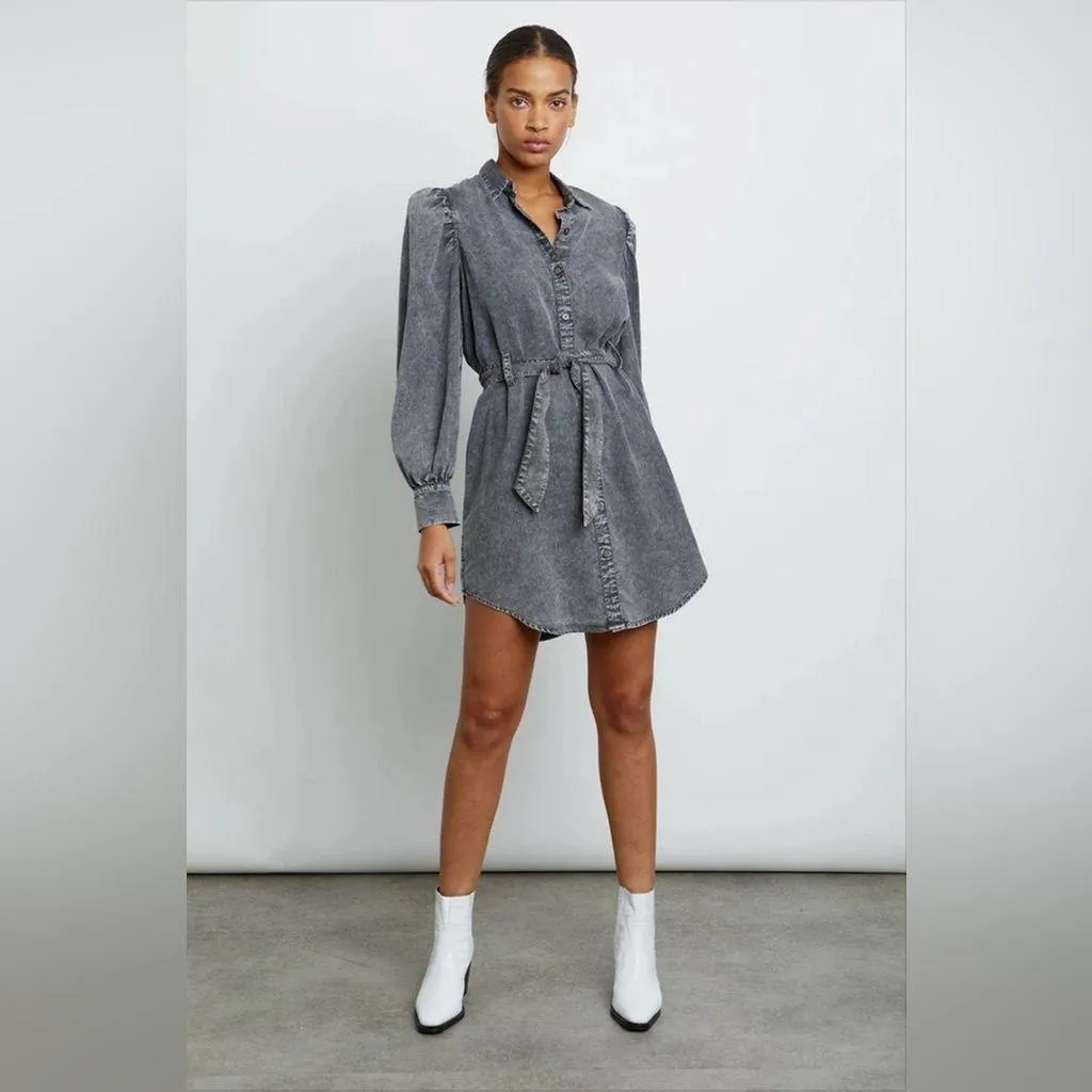 Rails Adele Black Acid Wash Denim Tie Waist Shirt Dress. A lightweight shirt dress in a soft, chic faded, acid black wash denim. Collared neckline. Center button down placket. Straight bodice. Shirttail hem. Long sleeves with slightly puff, gathered shoulders with single button cuffs. Detachable fabric tie waist. Unlined. Made in China. Fabric: 70% Lyocell, 19% Linen, 15% Ramie. Care: Machine wash cold. Condition: Preloved, gently used. Size: L large. Measurements: Bust: 44”* Waist: 46”* Hips: 48”* Length: 38”* *All measurements are approximate.