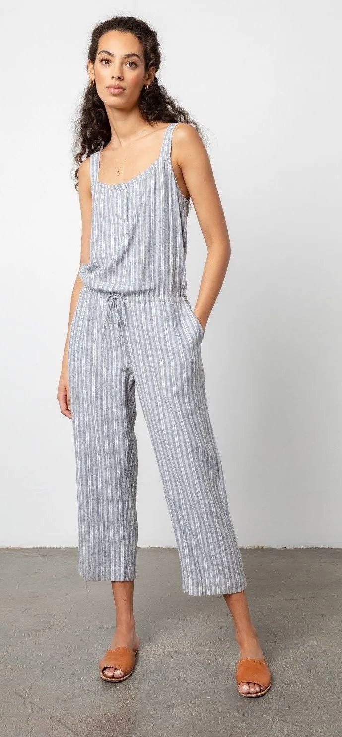 Rails Brooklyn crop jumpsuit, size small. There is light pilling from wear; otherwise, this beauty is in excellent condition! Measurements are as follows: 32" bust, 30" waist, 36" hips, 10" front rise, and 24" inseam. Retail $178. Easy-going striped jumpsuit with a relaxed fit and crafted with a heavy linen. * Scoopneck * Three-button placket * Sleeveless * Front slant pockets; back welt pockets * Drawstring waist * 70% rayon, 30% linen * Hand wash, line dry * Imported