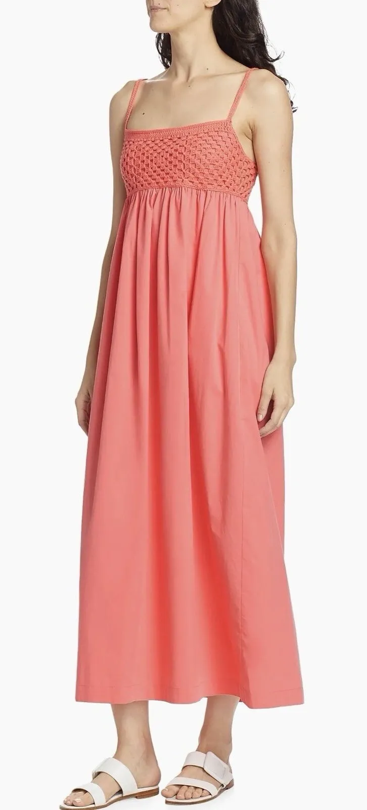 Measurements: Pit to pit 16- adjustable because of back straps Length 43.75 Rails' Meeka sleeveless maxi dress features a crocheted bodice, spaghetti straps, and a shirred babydoll waist. Crafted of crisp cotton, the breathable design offers a comfortable fit. Spaghetti straps Square neck Sleeveless Crochet bodice Shirred babydoll waist Back lace-up tie closure 100% cotton Combo: 60% cotton/40% acrylic About 43.75'' from shoulder to hem