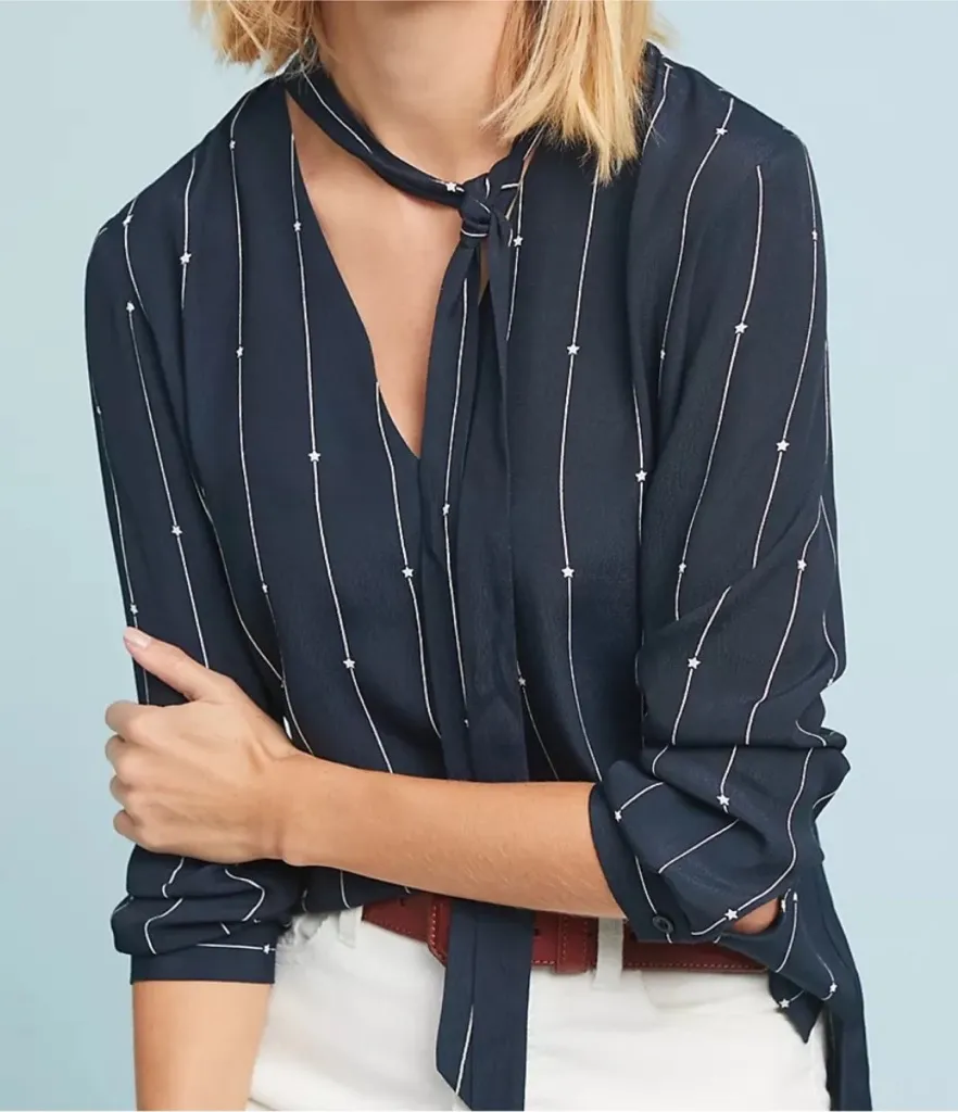 RAILS Rhea Tie Neck Striped Stars Print Navy Long Sleeve Top Excellent preowned condition Size XS - see photos for approximate measurements Approximately 18.5" pit to pit and 25" length Loose and flowy 100% Rayon Side slits Fabric buttons on sleeves Pullover style