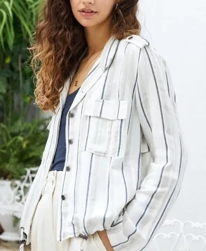 Excellent pre owned condition. No flaws. Lightweight, long sleeve linen jacket with button-down front and shoulder epaulets. Features flap chest pockets, drawstring hem with toggles, and back rain flap. Material: 55% Rayon / 45% Linen Measurements Pit to pit 22” Length 23” Sleeve 24”