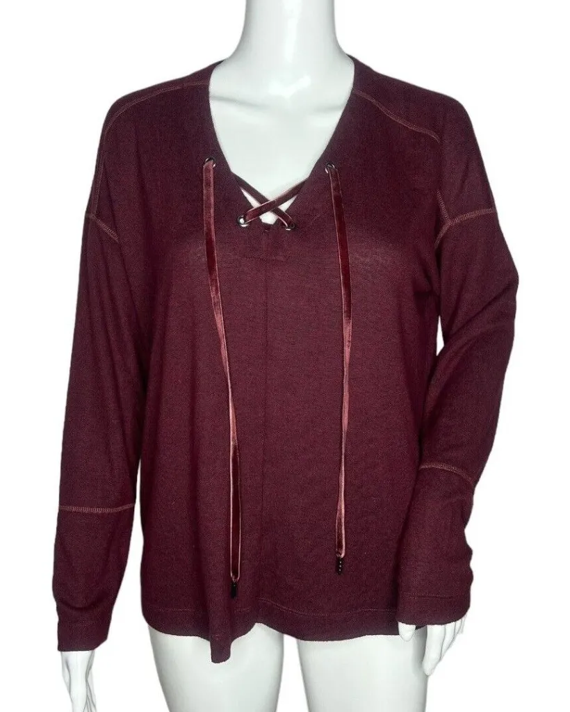 Rails Shirt Womens Small Red Port Leigh Heathered Long Sleeve Top Velvet Ties Women’s Size Small V-Neck Lace Up Neckline Pullover Style Stretch Polyester Rayon Spandex Blend Measurements are Approximate: Length 22” to 25” Armpit to Armpit 23” Gently Used Condition. No Rips Tears or Stains (B3)