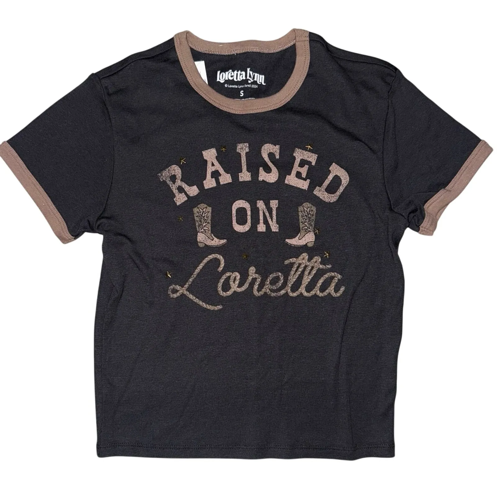 NWT The shirt is a black ringer tee with a tan/brown trim on the collar and sleeves. It features the graphic "RAISED ON LORETTA" with two cowboy boots and small star/stud details.