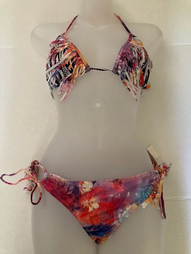 NWT Raisins Black & White Aztec with Multicolor Watercolor Print Bikini Removable Padding Red, Purple, Blue, Yellow, White & Orange Watercolor Print Adjustable Side Ties on Bottoms Can Cut Off Fringe if You Prefer No Liner, Bikini Never Worn, See Pictures Size Medium