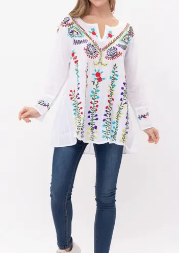 RAJ BELLE FLORAL EMBROIDERED DETAIL TUNIC This elegant white top features vibrant floral embroidery, perfect for adding a touch of color to your wardrobe. Ideal for casual outings or dressing up for special occasions. Small spot on back noted in pics Pit to pit 21 shoulder to hem 30