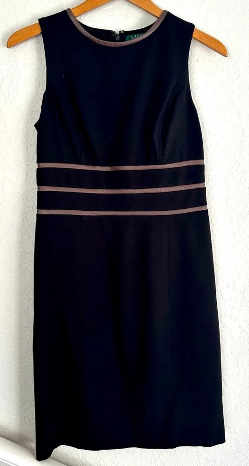 Ralph Lauren Black Shift Dress Brown Leather Size 6 Rayon blend Length 38” Excellent like new condi... Show more