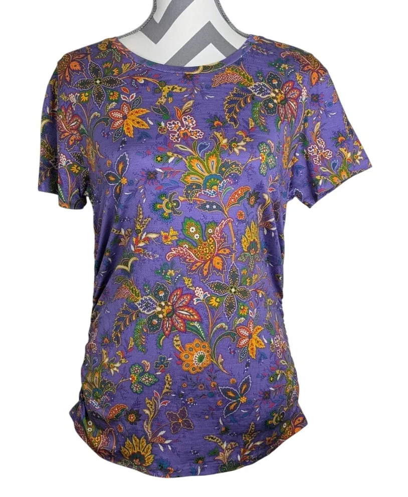 This gorgeous Ralph Lauren Collection top is in excellent condition and ready to make a statement! Here are some details: * Brand: Ralph Lauren Collection * Size: XL * Color: Purple background with red, orange, yellow and green flowers. * Pattern: Jacobean Floral Paisley Print * Condition: Excellent pre-owned condition. No flaws. * Material: Not specified, materials tag removed, but seems to be silk jersey. * Ruched sides * Short sleeves * Round crew neckline Offers and bundles welcome. This item ships quickly from a smoke-free environment.