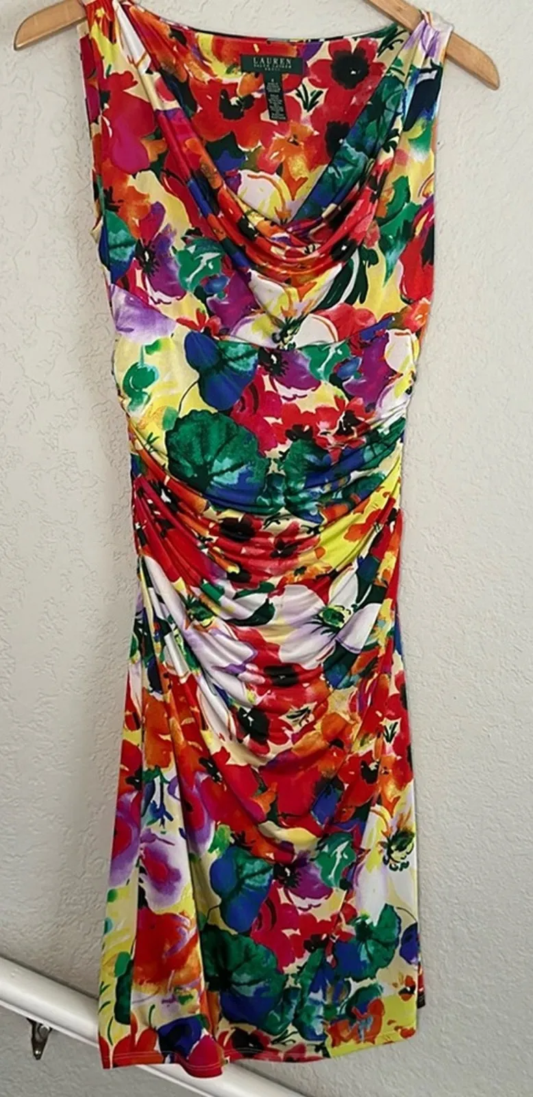 Ralph Lauren Colorful Ruched Sleeveless Dress Watercolor design in orange purple green yellow pink... Show more