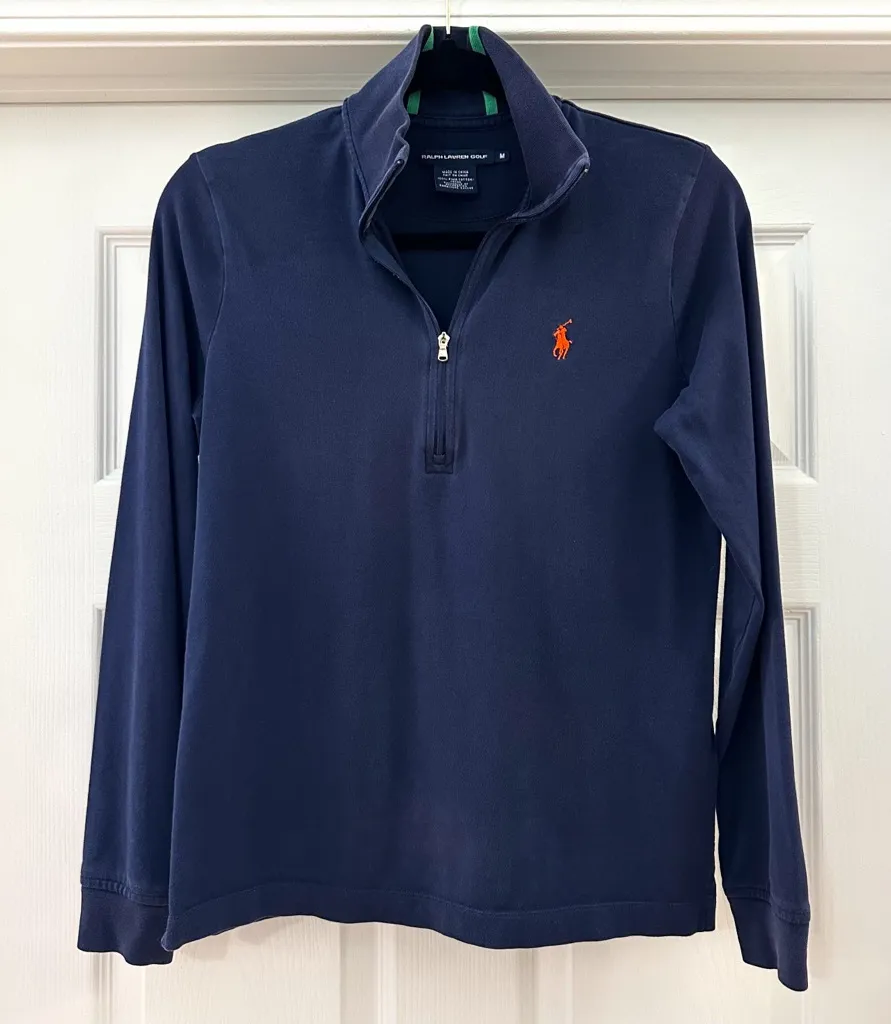 Ralph Lauren Golf Long Sleeve Polo Shirt Pima Cotton #3 Navy Blue. Size medium, but fits like a small. Ralph Lauren tends to run small. Good condition, except for a slight faint reddish discoloration pictured at the front, middle bottom. Preppy , country club , classic , tennis prep , golf , old money , polo , prep school , academia , college