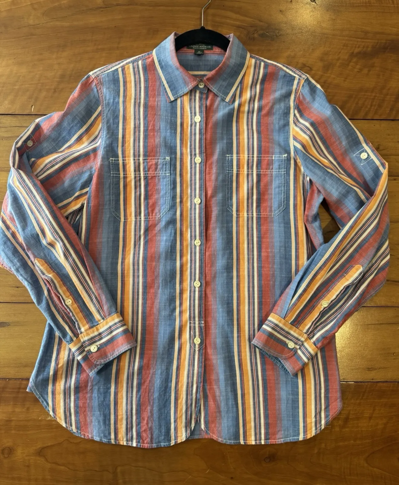 Women's Ralph Lauren Jeans Co. long sleeve button-up shirt in size Medium. Features vibrant multi-colored stripes in blue, red, yellow, and orange tones. Made from 100% cotton for comfort and breathability. Classic collar with chest pockets and button cuffs. Excellent pre-owned condition with no visible stains or damage.