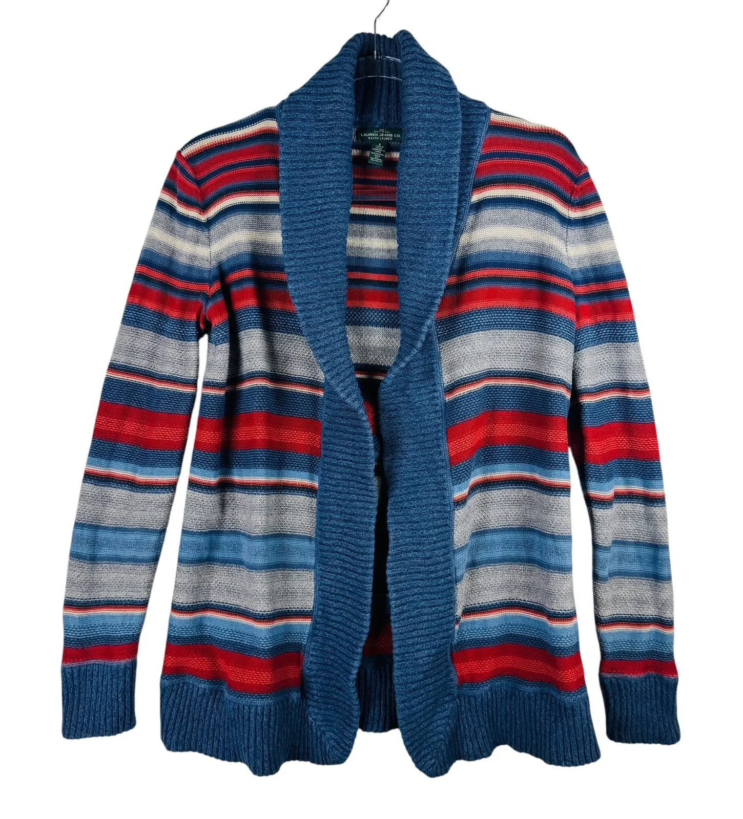Striped cardigan sweater from Lauren Jeans Co., a stylish and comfortable layering piece. This open-front cardigan features a vibrant striped pattern in shades of blue, red, and gray, adding a pop of color to any outfit. Keywords: LRL, polo, ralph lauren, southwest, serape, Lauren Jeans Co., striped cardigan, open front sweater, knit cardigan, shawl collar, blue red cardigan, womens sweater, casual cardigan, striped knitwear, size small, S, sweater, cardigan Condition as seen in photos. My home is smoke and pet free, but most of my items are pre-loved and sold as is. I try my best to spot and disclose any wear/flaws, but ask that you please give me a chance to address any issues that may arise as I am human and want your purchases to make you smile.