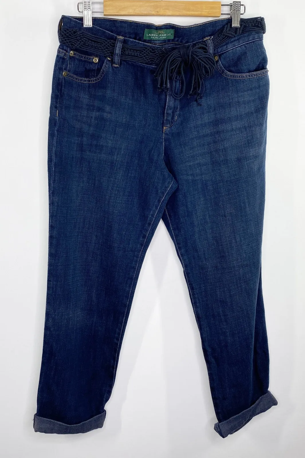 Dark wash blue denim cuffed capri jeans. Belted waist, pockets, belt loops. Cropped length with roll... Show more