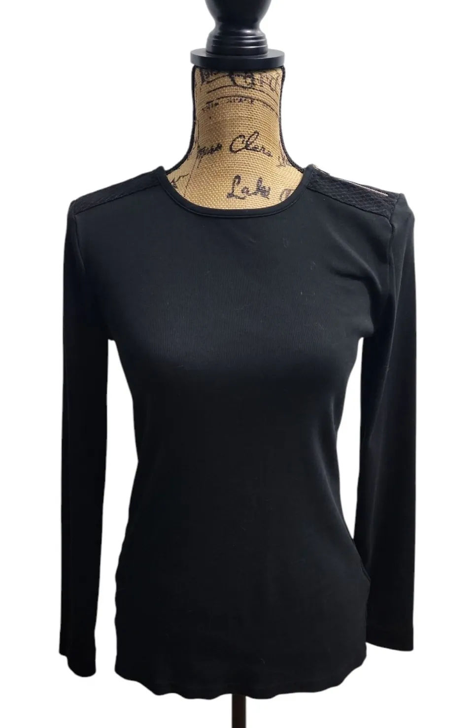 Keywords: Lauren Ralph Lauren, long sleeve top, black top, lace shoulder, crew neck, casual top, dressy top, fitted top, women's top, size M, classic style, elegant top, layering top, cotton blend