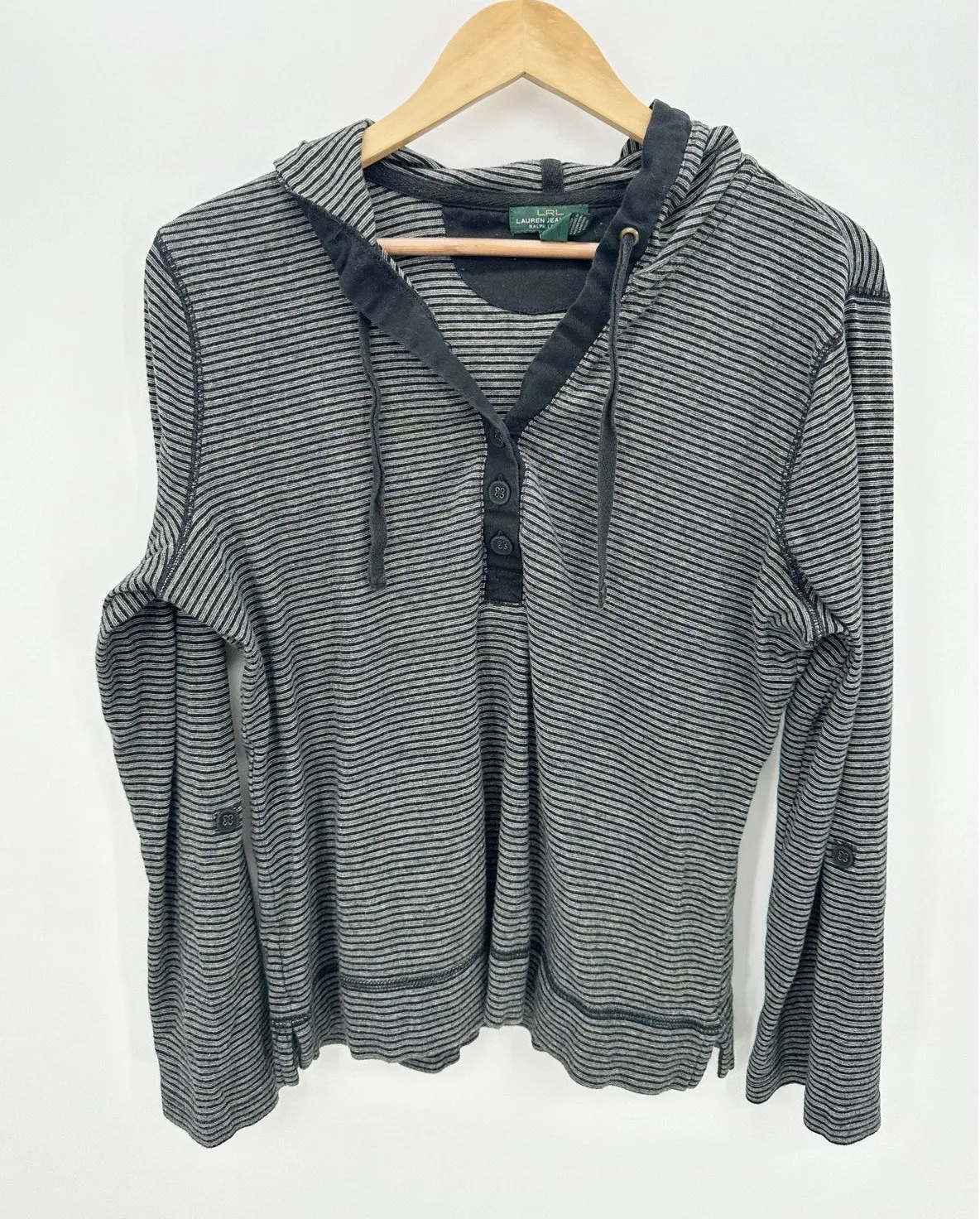 LRL Black White Striped Pullover Hoodie Shirt Roll Tab Women XL Cotton V-Neck Size: XL Condition:... Show more