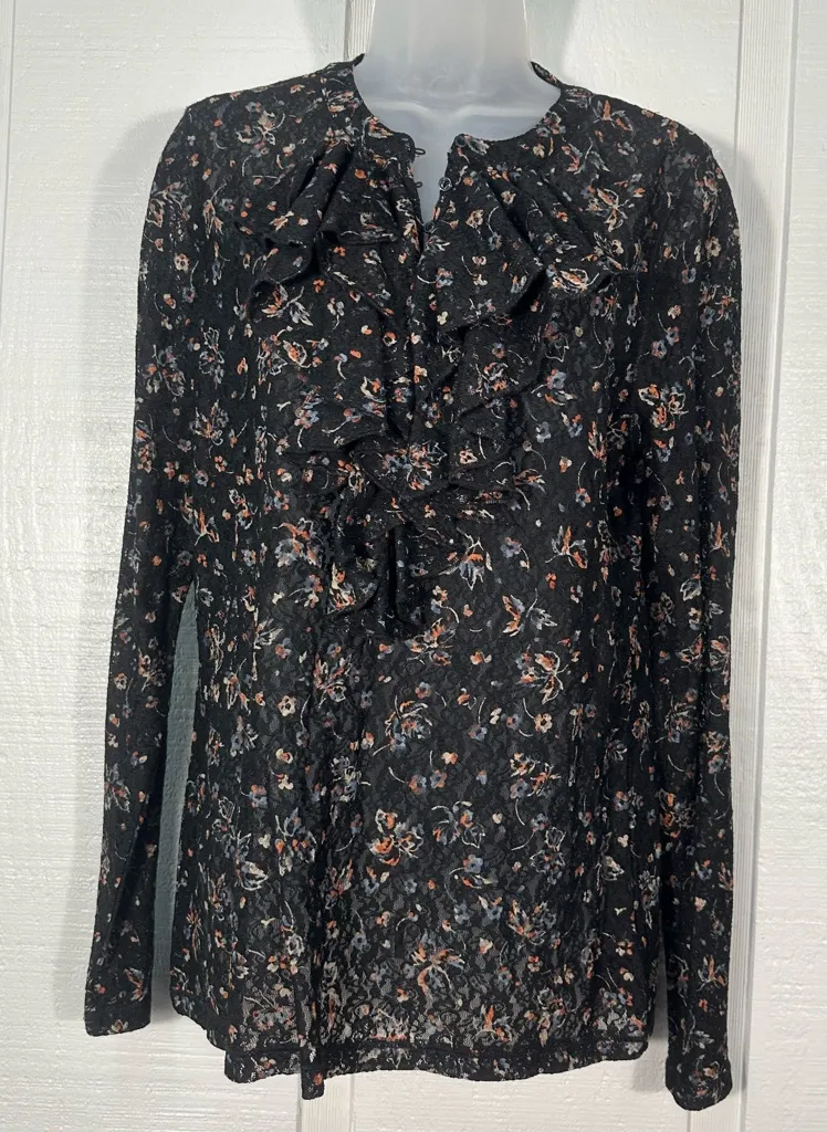 LRL Lauren Jeans Co. Black Floral Ruffle Long Sleeve Blouse Size Large EUC 26 inches pit to pit 2... Show more