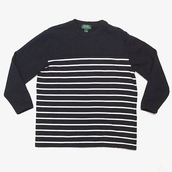 LRL Lauren Ralph Lauren Navy Stripe Crewneck Side Button 3/4 Sleeve Sweatshirt -Lauren french terry... Show more