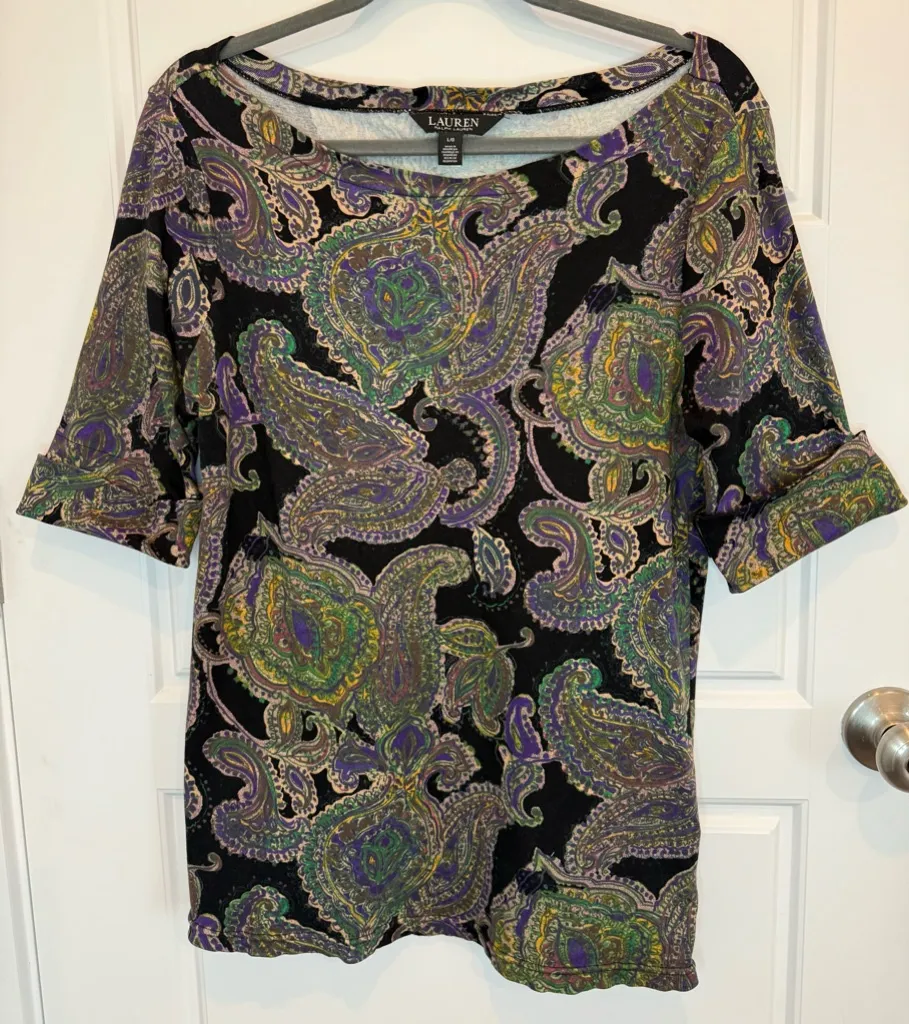 Ralph Lauren LRL Top Sz LARGE Black Purple Paisley Boat Neck Cotton Knit EUC - $18 - From Jessica
