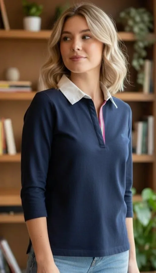 Chic navy blue top with a crisp white collar. Ideal for a polished look.