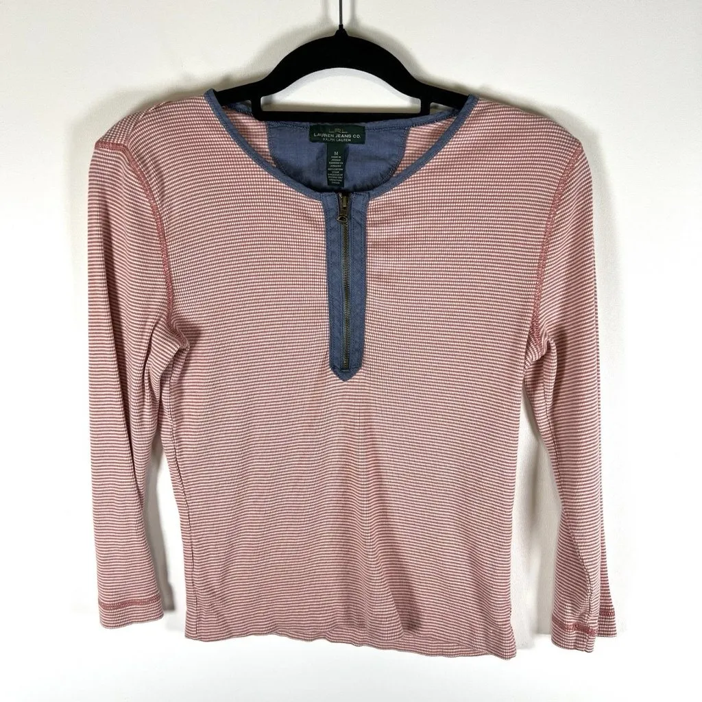 The product is a Ralph Lauren Lauren Jeans Co top with a 3/4 sleeve and a zip neckline, made from st... Show more
