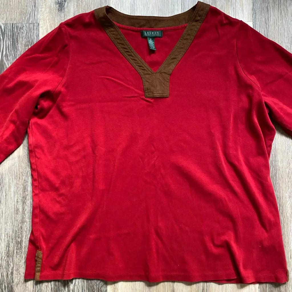 Classic Ralph Lauren women’s V-neck top in bold red with luxe brown suede trim for a touch of sophis... Show more